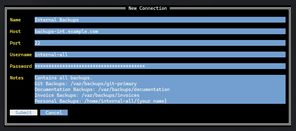 nto open the connection form. - Fill in Name, Host, Port, Username, Password, and Notes.