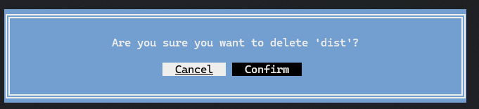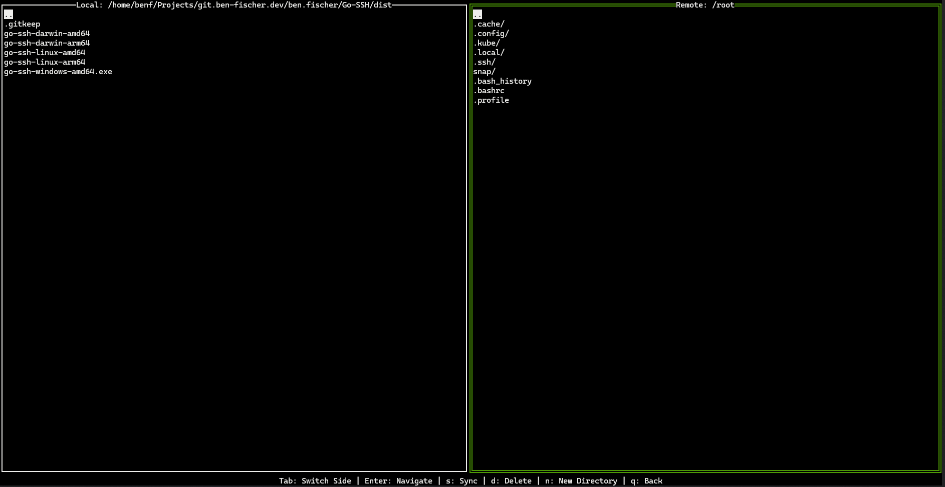 s: Sync the selected item (upload from local or download from remote).d: Delete the selected item (local delete or recursive remote delete after confirmation).n: New directory in the active pane.q: Back to the main screen and close the SFTP session.