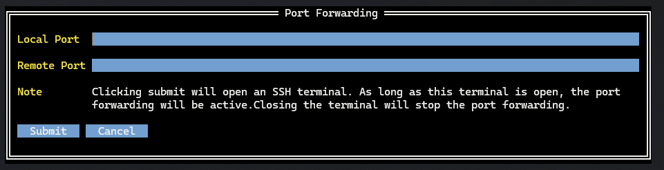 pto open the port forwarding dialog. - Enter the Local Port and Remote Port, then submit.