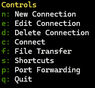 n: New connectione: Edit connectiond: Delete connectionc: Connectf: File transfers: Shortcutsp: Port forwardingq: Quit