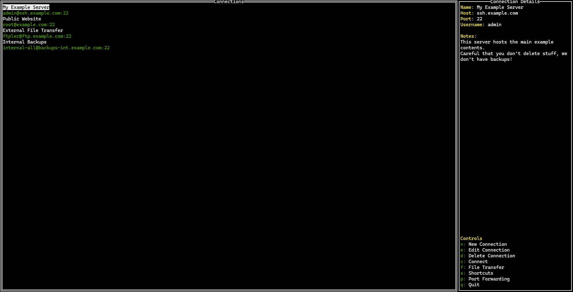 Terminal UI for managing password-based SSH connections with encrypted storage, SFTP file transfer, shortcuts, and port forwarding.