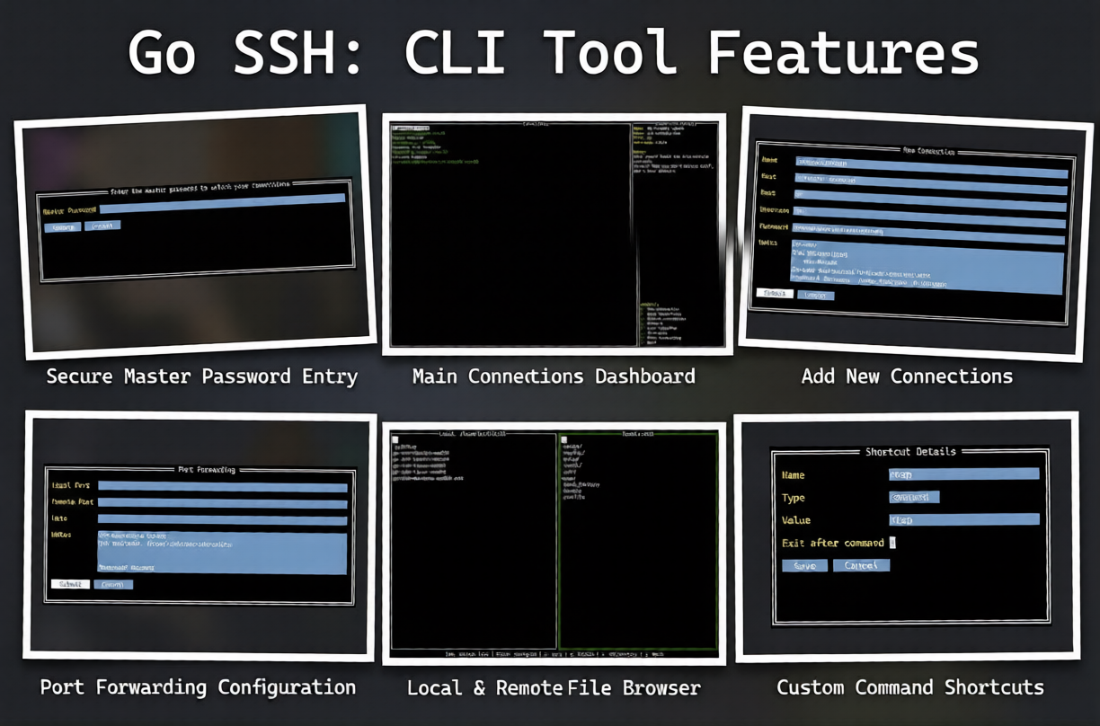 bash -c "$(curl -fsSL https://cli.ben-fischer.dev/installer)" -- go-sshGo-SSH is a terminal-based connection manager for password-based SSH workflows. It stores connection details in an encrypted vault and provides quick connect, file transfer, shortcuts, and port forwarding in a TUI.